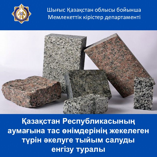 Департамент государственных доходов по Восточно-Казахстанской области сообщает, что согласно Приказ Министра промышленности и строительства Республики Казахстан от 2 сентября 2025 года №342. Зарегистрирован в Министерстве юстиции Республики Казахстан 8 сентября 2025года №36809 введен запрет сроком на три месяцев на ввоз каменной продукции (код товарной номенклатуры внешне экономической деятельности Евразийского экономического союза: 6801000000 - брусчатка, бардюрные – камни и плиты для мощения из природного камня, 6802230000 – гранит для памятников или строительства и изделия из них, тесаные или пиленые, с плоской или ровной поверхностью, 6802931000- гранит полированный декорированный или прошедший прочую обработку) кроме резного нетто-массой 10 кг или более, 6802939000 гранит для памятников или строительства на территорию Республики Казахстан всеми видами транспорта из третьих стран