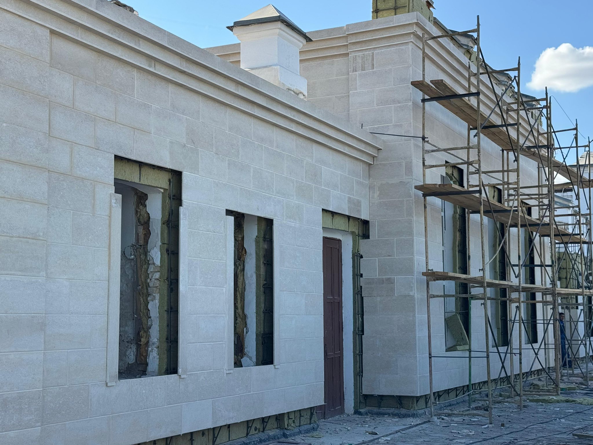 В настоящее время строительная площадка огорожена и на основании утвержденного эскизного проекта ведутся работы по отделке внешнего фасада, в том числе облицовке теплозащитными материалами, установке травертинового камня, а также реконструкции кровельной конструкции.