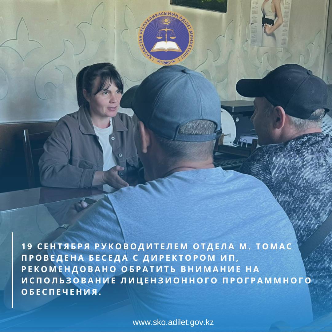 19 сентября руководителем отдела М. Томас проведена беседа с директором ИП, рекомендовано обратить внимание на использование лицензионного программного обеспечения. Интернет пиратство –один из видов нарушений прав интеллектуальной собственности.