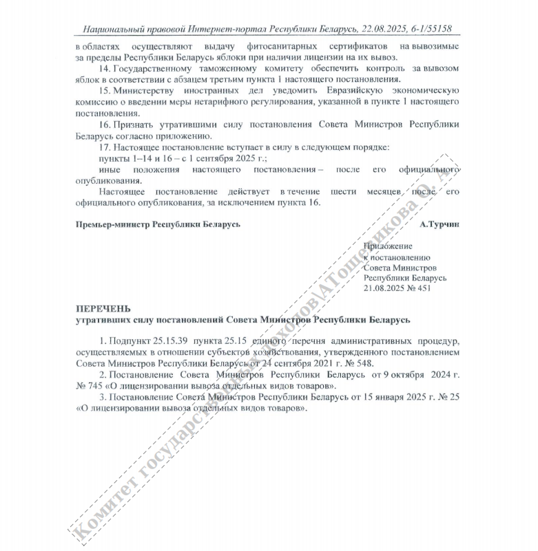Основание: постановление Совета Министров Республики Беларусь от 21 августа 2025 года № 451.