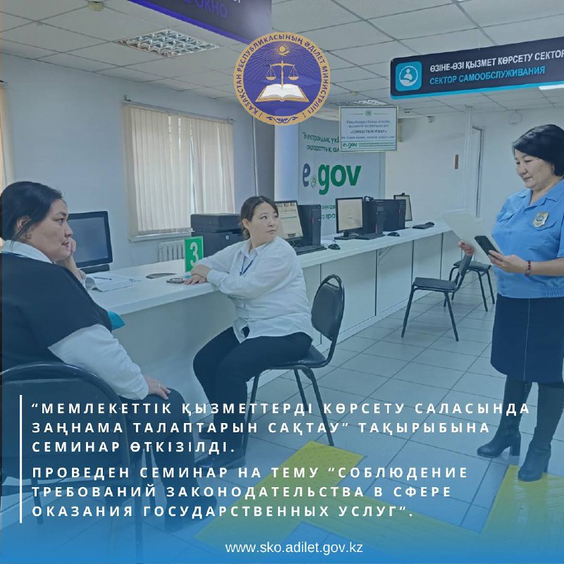 20 октября 2025 года руководителем отдела «Межрайонный территориальный отдел принудительного исполнения №3» РГУ «Департамент юстиции Северо-Казахстанской области» А. И. Уразмбетовой проведён семинар с сотрудниками ЦОНа на тему: «Соблюдение требований законодательства в сфере оказания государственных услуг».