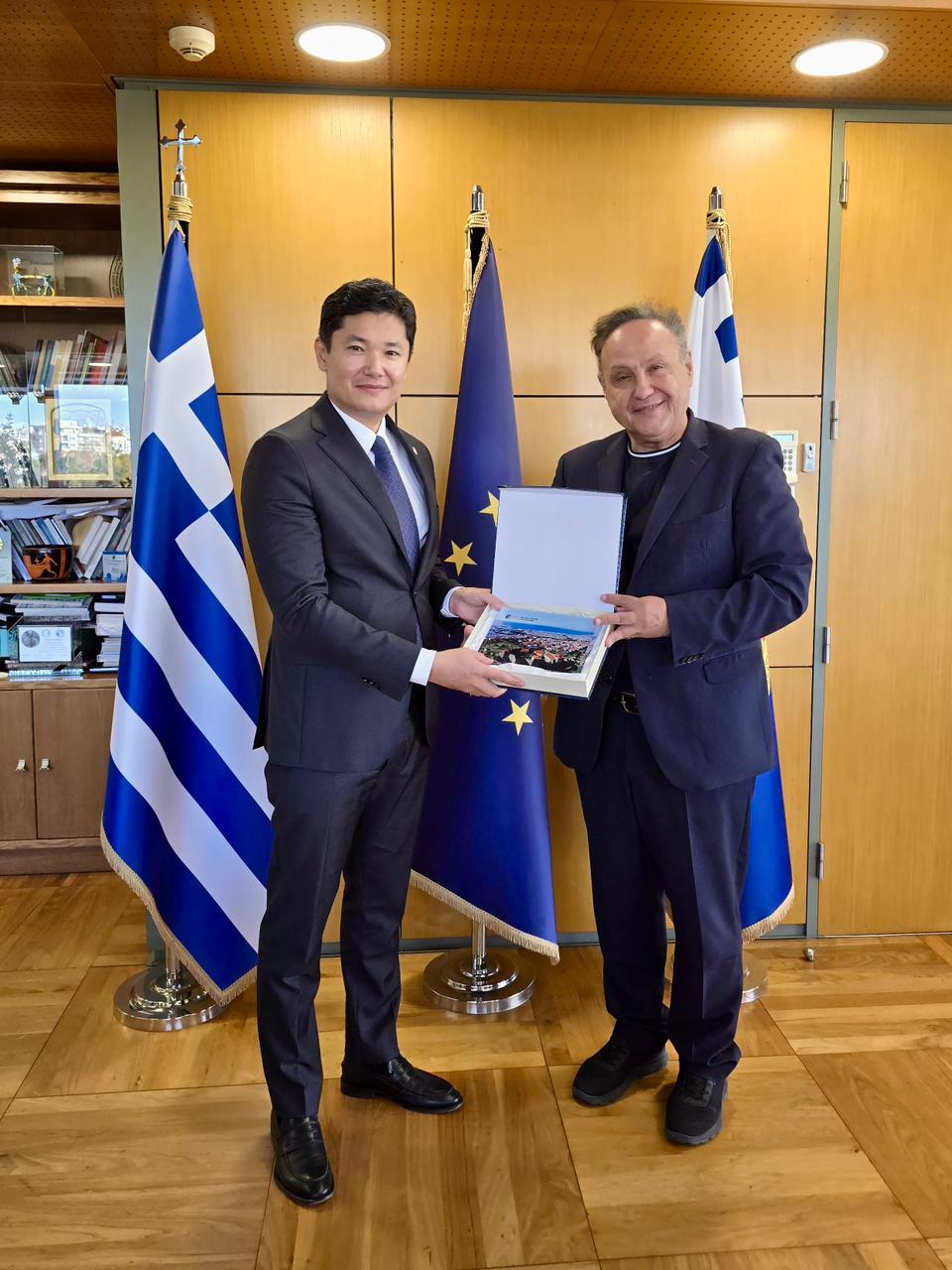 Во время встречи с Мэром города Салоники Стелиосом Ангелудисом обсуждены вопросы укрепления партнёрских связей между регионами двух стран, в том числе взаимодействие в области городской инфраструктуры, транспортных и логистических решений, цифровизации муниципального управления, туризма, а также реализации культурных инициатив. Особое внимание уделено возможностям установления побратимских отношений между Салониками и одним из крупных городов Казахстана, развитию прямых контактов между торгово-промышленными палатами и бизнес-ассоциациями. Мэр Ангелудис отметил, что Казахстан является надёжным партнёром Греции в Центральной Азии, подчеркнув готовность города «стать мостом между Балканами и Казахстаном, объединяя усилия в сфере транспорта, логистики и культуры». По итогам переговоров стороны подтвердили заинтересованность в проведении Дней культуры Казахстана в Салониках, развитии прямых контактов между образовательными и инновационными структурами двух стран и усиления туристического обмена.