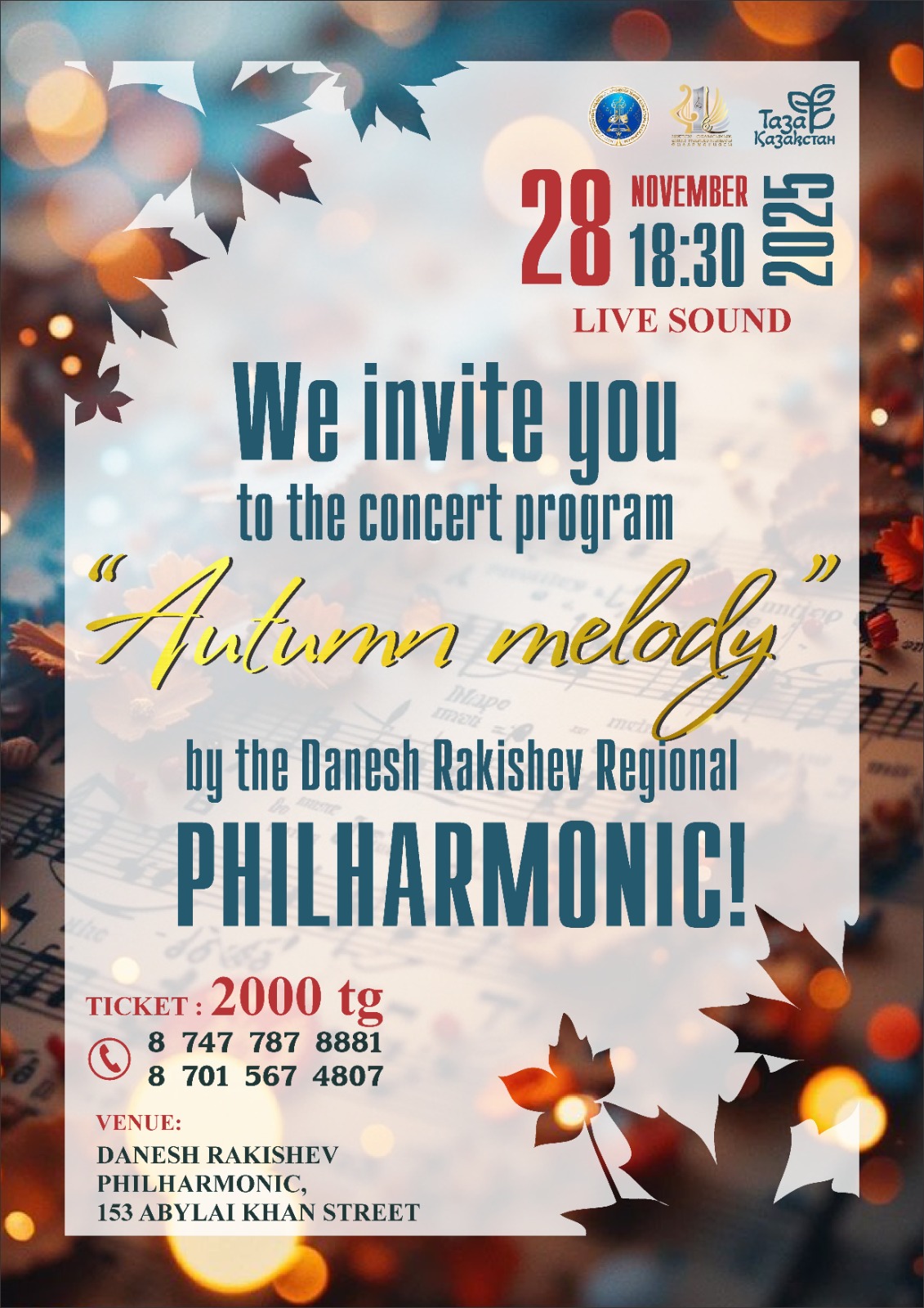 Приглашаем вас на концертную программу «ОСЕННЯЯ МЕЛОДИЯ» областной филармонии имени Данеша Ракишева!