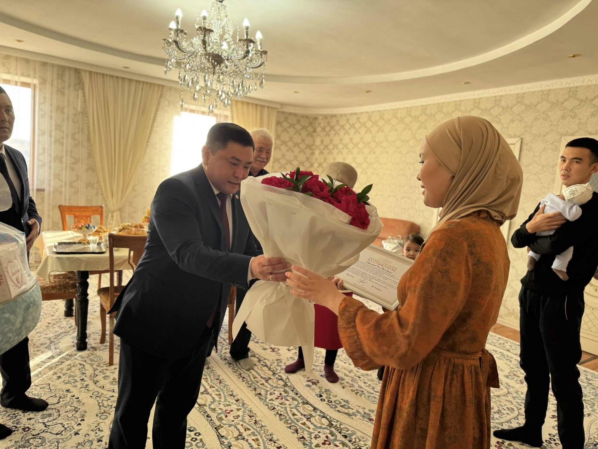 В ходе поздравления аким района пожелал новорождённым крепкого здоровья и светлого будущего. Также он пожелал благополучия и крепкого здоровья всей семье, вручил Благодарственное письмо акима района и памятный подарок.