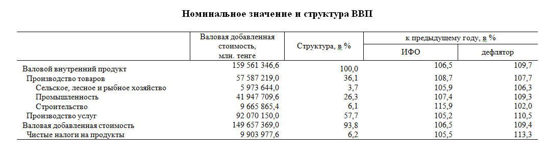 Согласно оперативным данным индекс физического объема ВВП Казахстана за 2025 год по отношению к соответствующему периоду 2024 года составил 106,5%. В структуре ВВП доля производства товаров занимает 36,1%, услуг – 57,7%.