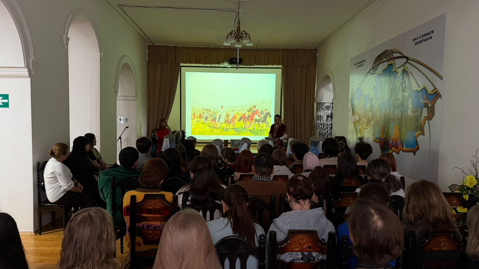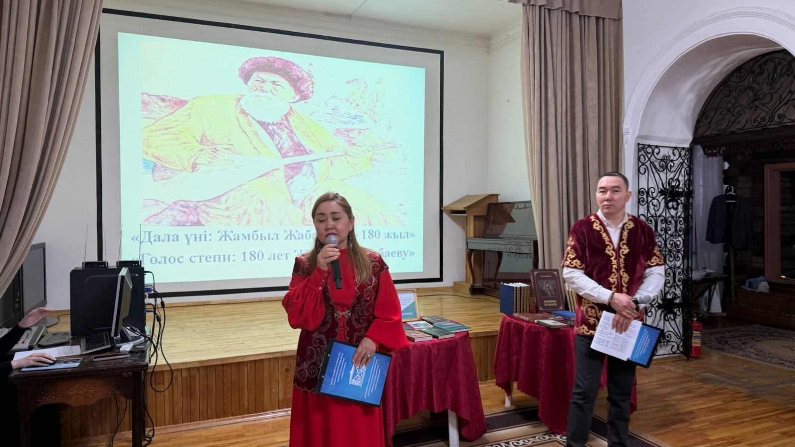 В ВКО этнографическом музее прошел литературно-музыкальный час, посвященный юбилею великого акына. На мероприятие были приглашены сотрудники областной библиотеки им. Пушкина, студенты высшего колледжа им. Кумаша Нургалиева, народный ансамбль «Ақ босаға» дома Дружбы, солисты фольклорного ансамбля «Белес». Тематическая презентация, стихи Жамбыла, народные песни, игра на домбре, рассказ о книгах, посвященных акыну – всё это создало лирическую атмосферу встречи. Участники не просто были простыми слушателями мероприятия, они активно участвовали в беседе о творческом пути Жамбыла.