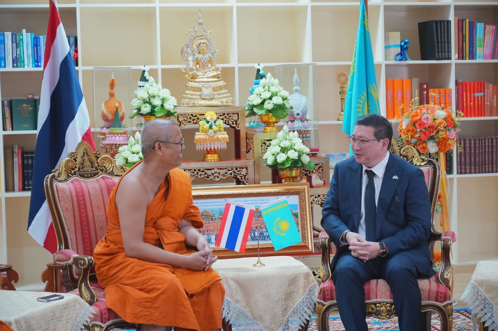 В рамках расширения научно-образовательного сотрудничества Посол посетил государственный буддийский университет Маха Чулалонгкорн Раджавидьялая, где обучается около 25 тысяч студентов, из которых около 20% составляют иностранные студенты. В университете состоялась встреча с руководством ВУЗа, а также лекция Посла для студентов и слушателей, в ходе которой он рассказал о проводимых в Казахстане конституционных реформах, роли страны в продвижении межрелигиозного диалога, а также деятельности Секретариата Съезда лидеров мировых и традиционных религий, направленной на укрепление взаимопонимания, мира и гармонии между религиями и культурами. В завершение программы визита на территории университета состоялась символическая церемония посадки деревьев от имени Посольства Казахстана в Таиланде.