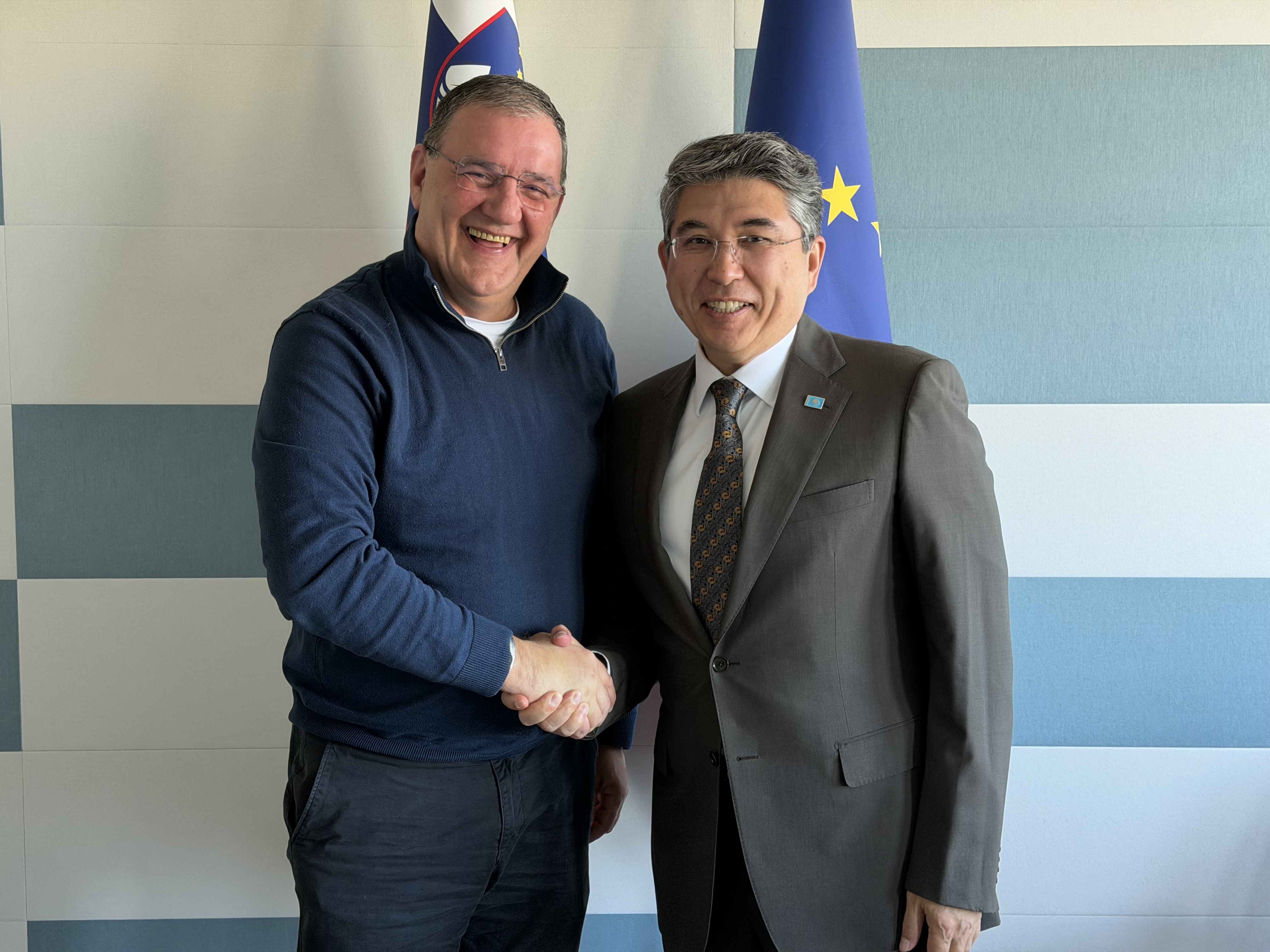 Любляна, 23 апреля 2026 г. - Посол Казахстана в Словении Алтай Абибуллаев провёл встречу с Генеральным директором Директората авиационного и морского транспорта Министерства инфраструктуры Словении Томажем Печником, в ходе которой стороны обсудили перспективы развития казахстанско-словенского сотрудничества в сфере транспорта, логистики и транзита.
