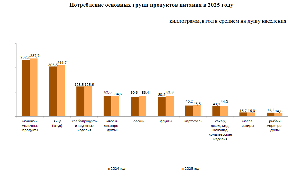 Потребление по отдельным видам продуктов питания на душу населения в среднем за месяц 2025 года составило: картофеля – 3,8 кг, хлеба пшеничного из муки 1 сорта – 2,4 кг, говядины – 2,1 кг, яблок - 1,6 кг, сахара-песка - 1,5 кг, риса – 1,4 кг, молока сырого – 1,1 л, кефира- 1 л, яиц – 17,6 штук, макаронных изделий –0,9 кг, рыбы свежей или охлажденной - 0,8 кг, чая черного - 0,1 кг.